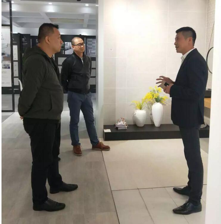 ▲依諾企業(yè)營(yíng)銷中心總經(jīng)理田慶忠(右)向紅星美凱龍的領(lǐng)導(dǎo)介紹依諾瓷磚總部展廳