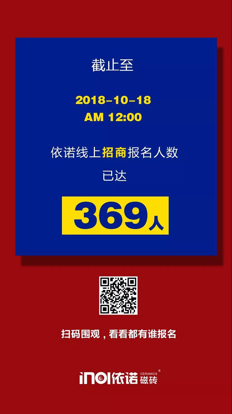 截止10月18日,中午12:00,依諾瓷磚品牌線上【招商小程序】報名人數已達369人,且其中超過80%的經銷商已經在陶博會期間前往依諾瓷磚總部展廳進行深入洽談。