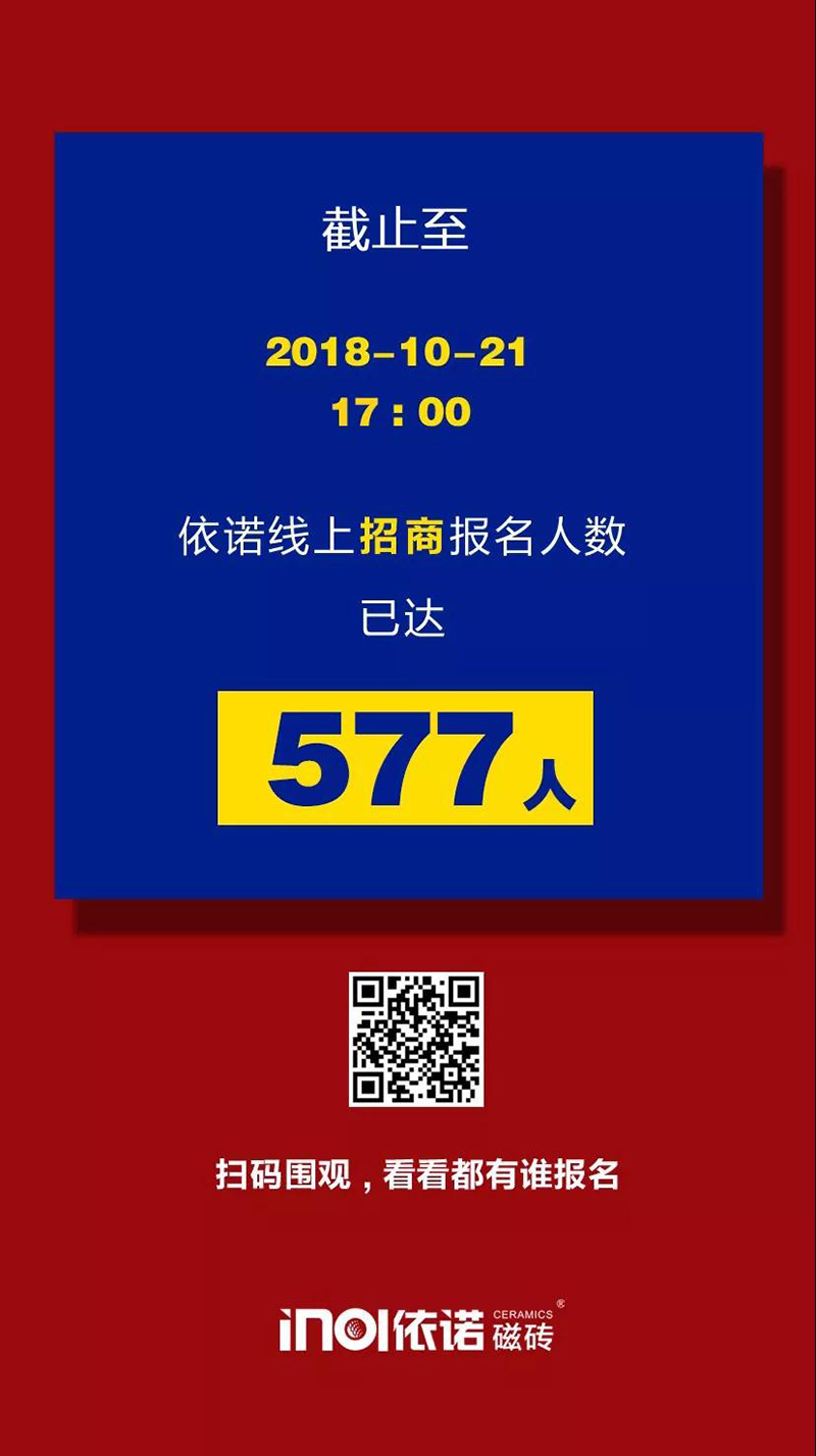 本屆陶博會,依諾瓷磚品牌憑借【100人分1個億】的招商加盟政策刷屏陶瓷圈。截止10月21日,下午17:00,依諾瓷磚品牌線上【招商小程序】報名人數已達577人,且其中超過90%的經銷商已經在陶博會期間前往依諾瓷磚總部展廳進行深入洽談。
