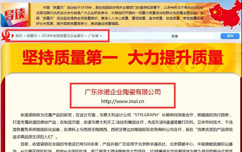 2018年9月,國家市場監督管理總局、中共中央宣傳部聯合相關部門及中國質量檢驗協會,以“加強市場監管,建設質量強國”為主題,共同開展2018年全國“質量月”活動(以下簡稱2018“質量月”活動),依諾瓷磚企業積極響應號召,憑借二十年如一日的誠信經營、優質的產品和良好的口碑,在本次2018“質量月”活動中脫穎而出,廣東佛山依諾瓷磚企業榮獲“全國質量誠信標桿典型企業”、佛山依諾瓷磚企業榮獲“全國質量誠信示范企業”兩項榮譽稱號。