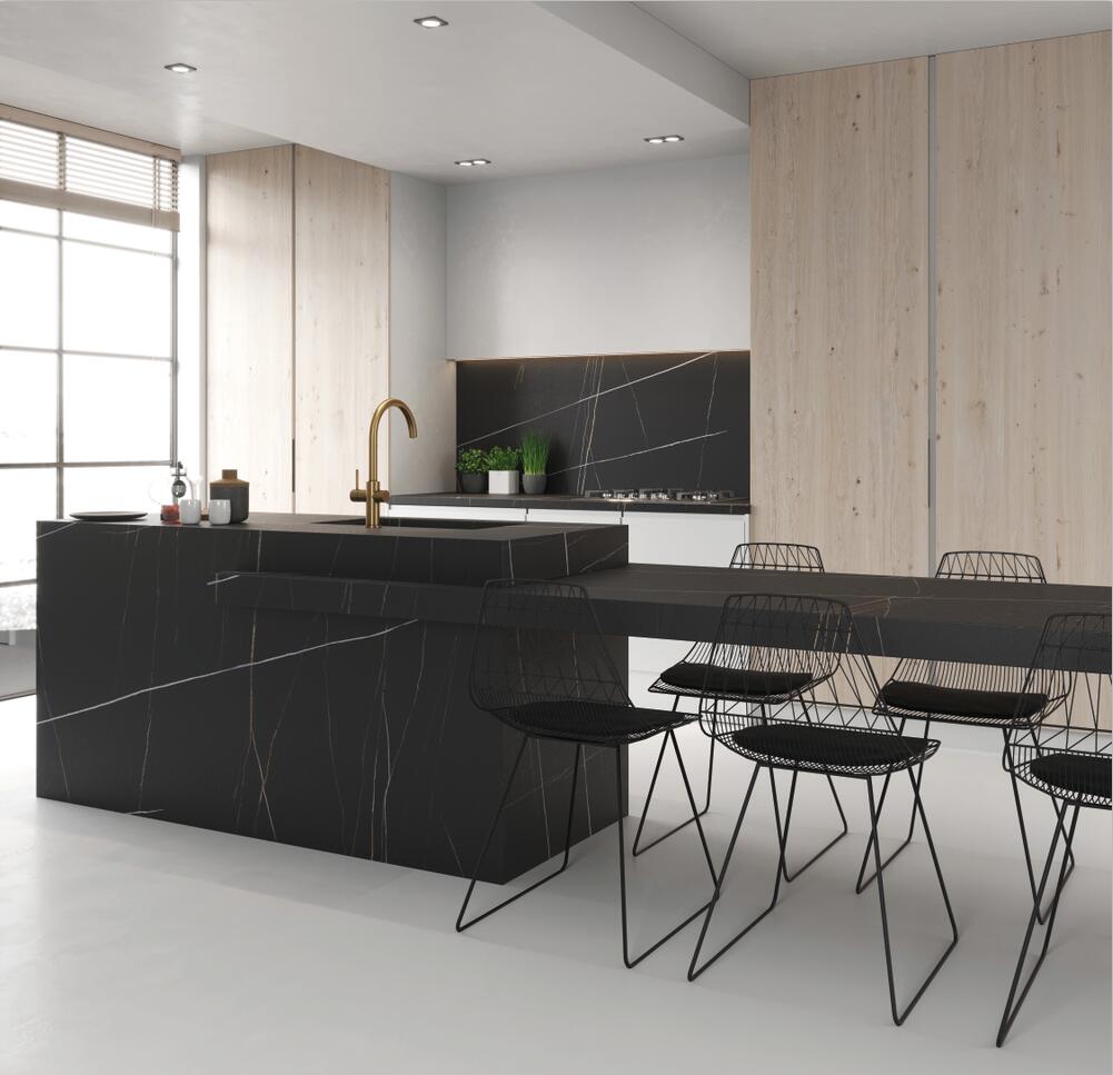 該系列為西班牙知名巖板品牌INALCO(意奈蔻)的原裝進口巖板產(chǎn)品。靜謐的黑色搭配簡約的紋理,散發(fā)著時尚與精致的魅力。作為巖板,它不僅能上墻下地,還能應(yīng)用于各種室內(nèi)外裝飾場合,如臺面、柜體、柜門、案板、家具等。