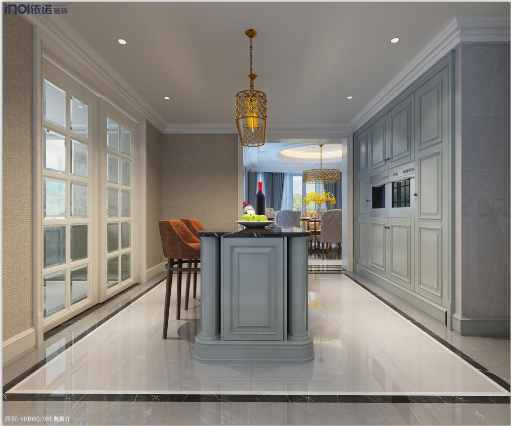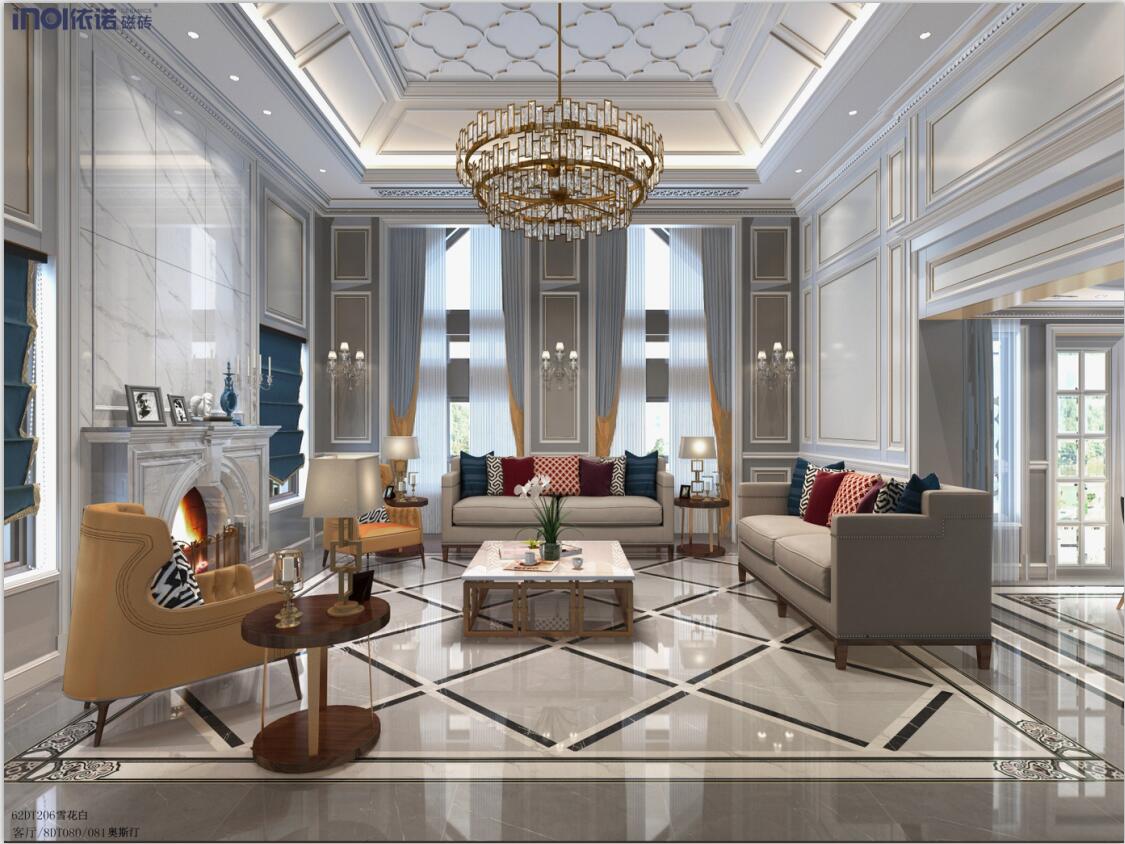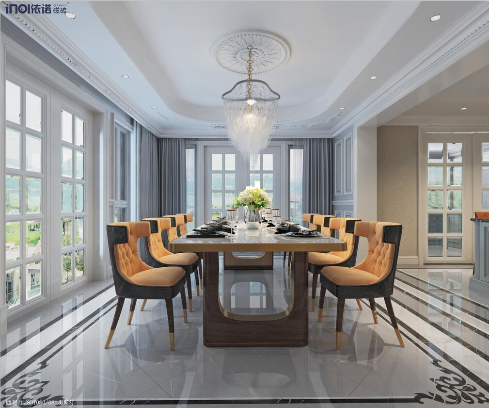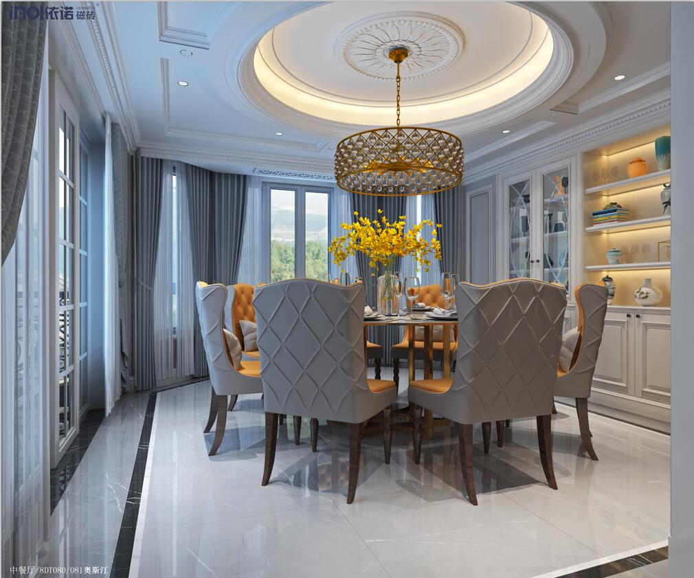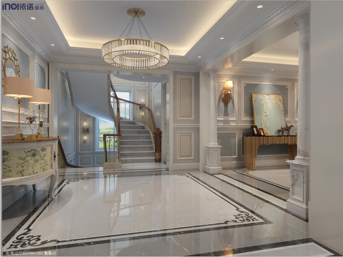 本案為三層現代簡歐輕奢別墅,建筑面積約600㎡,空間選用依諾瓷磚品牌通體大理石、大理石瓷磚、陶瓷大板、巖板定制等產品。涵蓋客廳、過廳、中西餐廳、中西廚房等,功能齊全。設計師以經過提煉的歐式線條勾勒空間的簡約大氣之感,以高級灰為基調,搭配精心配色的軟裝,盡顯現代輕奢美學的內在優雅氣韻。