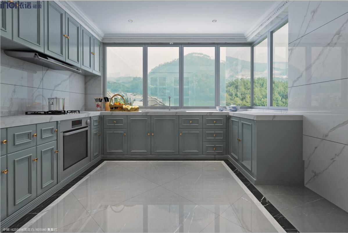 “高級灰大理石瓷磚”的魅力再次大顯身手,舒緩平和,傳遞靜謐之感,淺灰藍的木質櫥柜與其相呼應,讓空間擺脫廚房的傳統印象,成為高級的化身,讓烹飪變成一件優雅的事情。