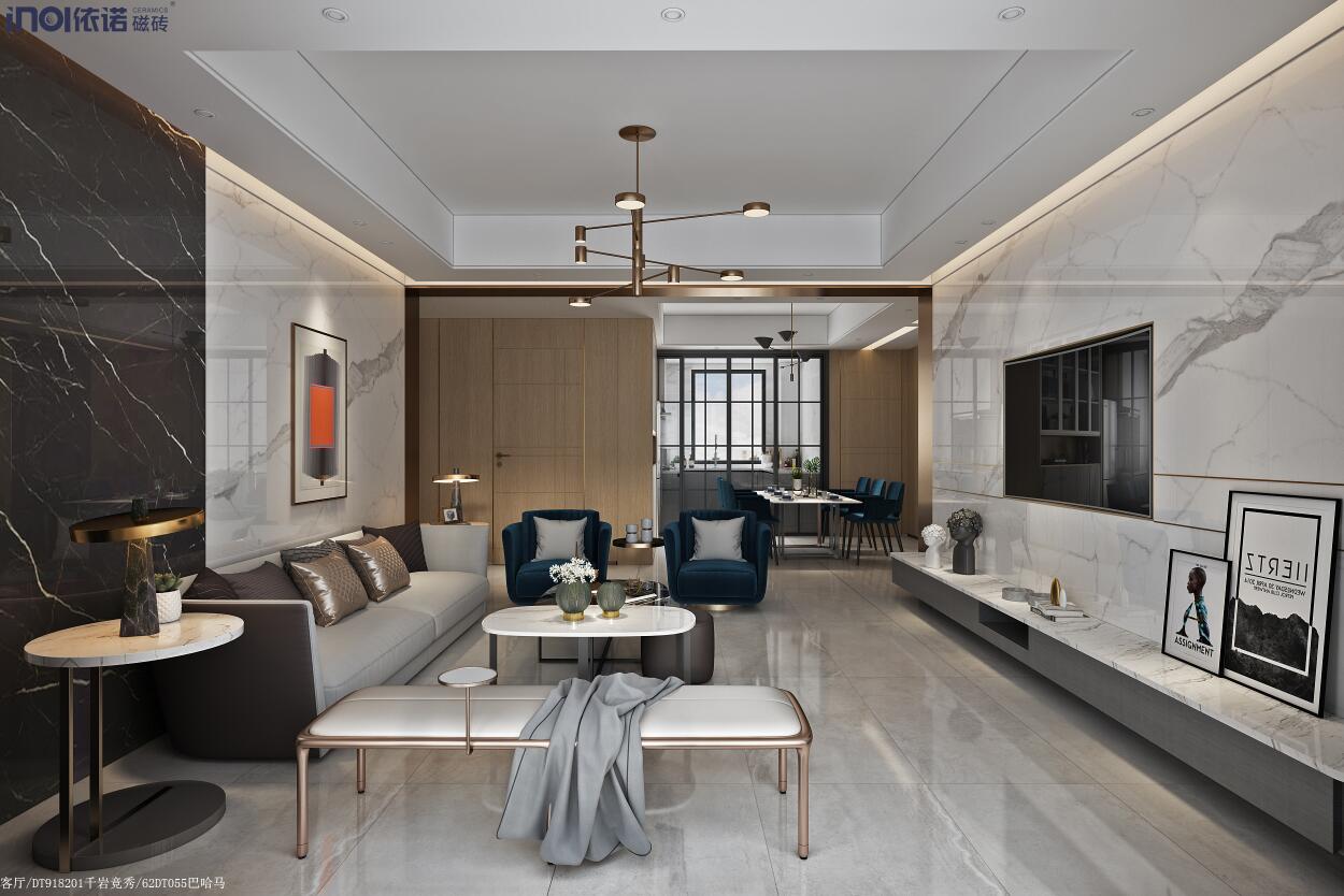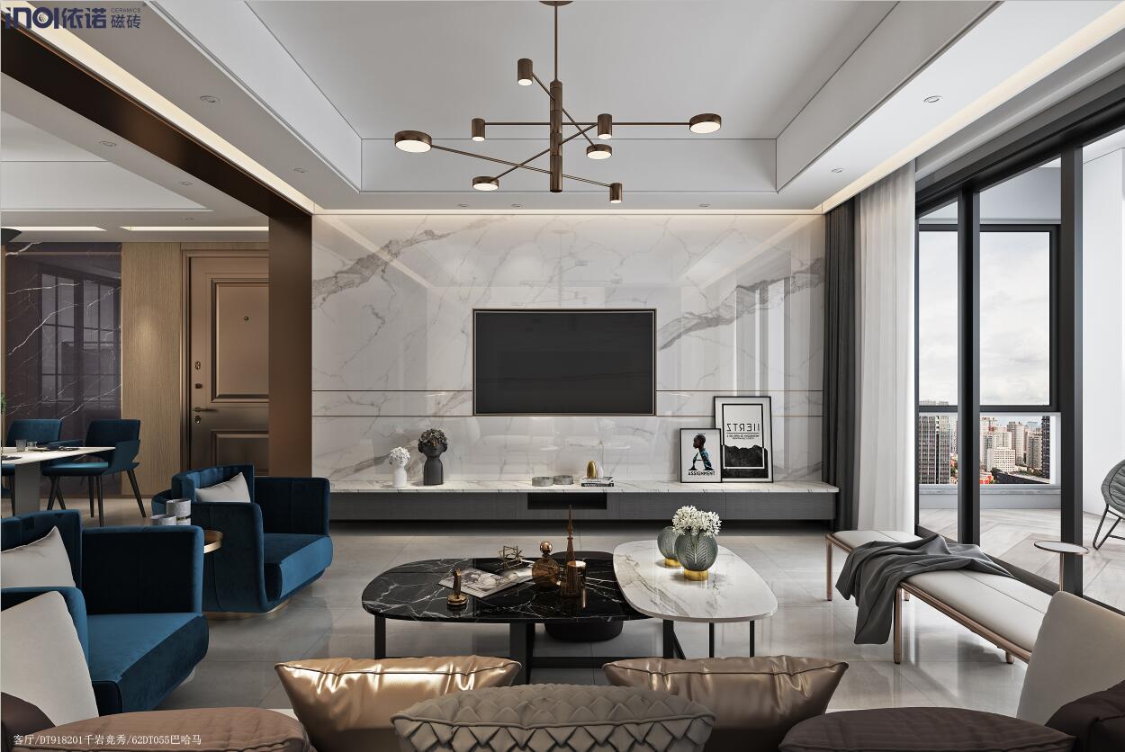 地面采用了依諾瓷磚【通體大理石】巴哈馬系列,畫面設計靈感來源于天然海灘紋理,溫和的淺灰色調,搭配同色系沙發,點綴金屬材質,借由藍色絲絨沙發的融入,撩撥出一分活潑生動,現代與閑適并存。