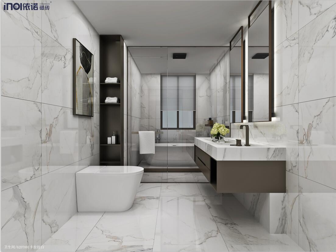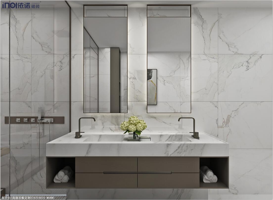 墻地均采用了依諾瓷磚【通體大理石】卡拉拉白系列,通體潤澤,宛如純白雪域,紋理似絲絹般飄逸,散發出純潔高貴氣質,洗手臺為依諾【高級巖板定制】產品,整體空間呈現干凈、流暢的形態。