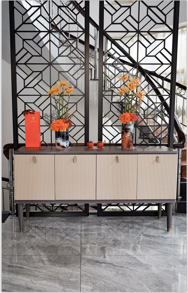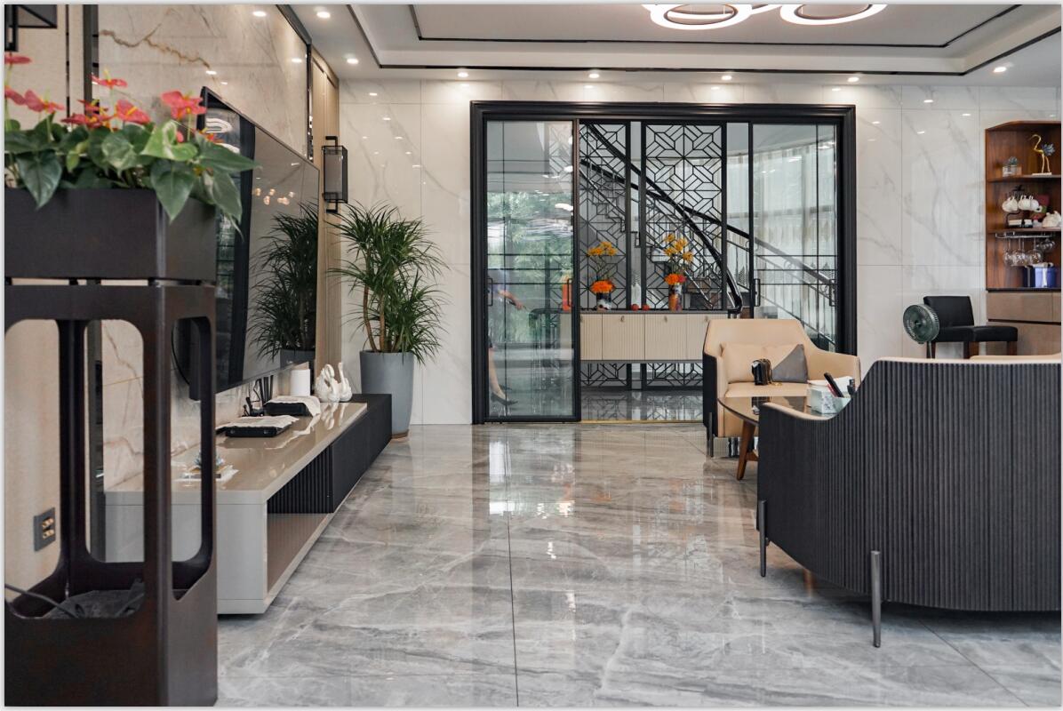 電視背景墻采用依諾瓷磚「歲月鎏金」系列,斑駁縱橫的原石肌理,沉穩(wěn)中透露著高貴,連紋設(shè)計(jì),更顯大氣。