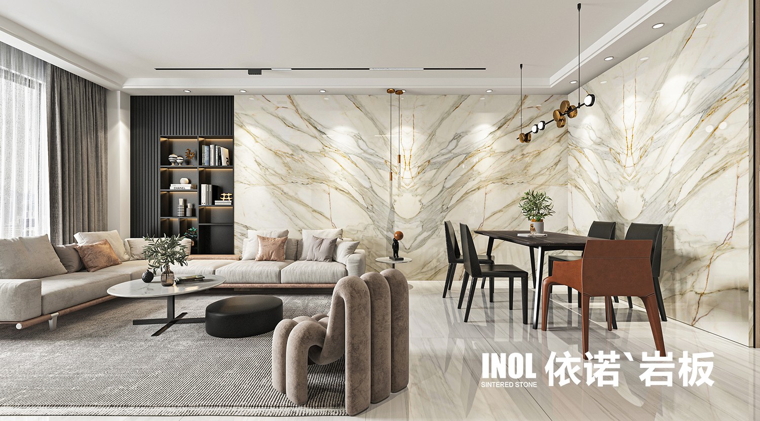 空間的自由感、尺寸感與美感,一切都是為產品服務。依諾在本次展會將推出1600×3200mm、1200×2800mm、800×2600mm三種大巖板【一片到頂】產品,能夠因應裝飾性和實用性的變換,在不同的空間中直接套用,無縫無拼接,整體感更強,視覺效果更美觀。