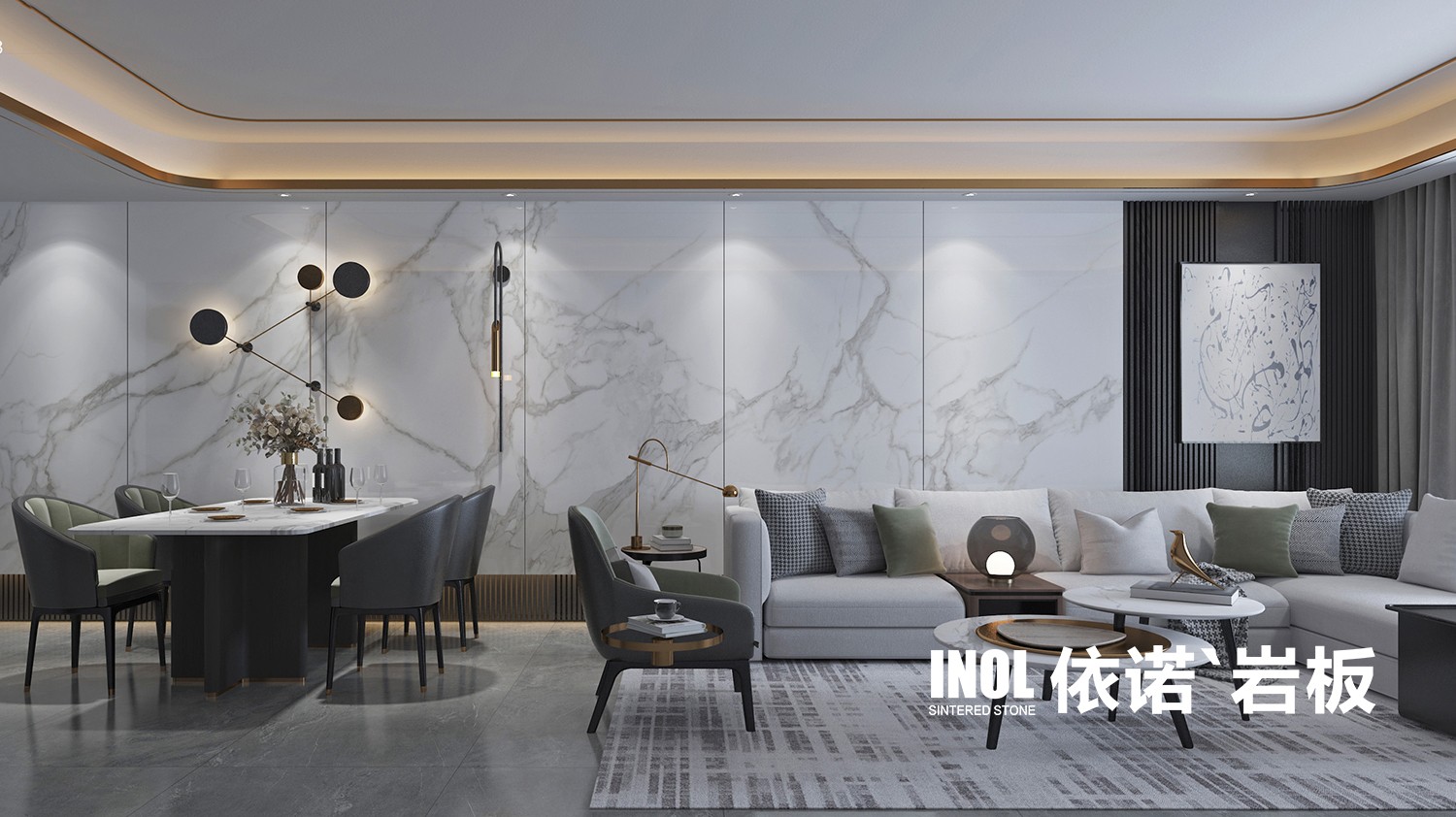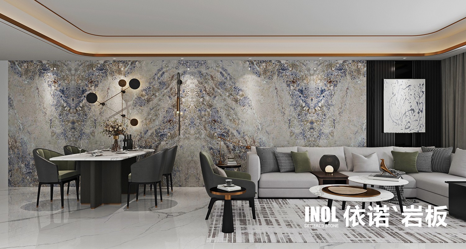 依諾大巖板【一片到頂】,上墻無需拼接,從別墅到小戶型,從客廳到衛浴,承載紋理元素更多,花色更連貫,給人視線上的延伸感,展現空間的恢弘大氣。