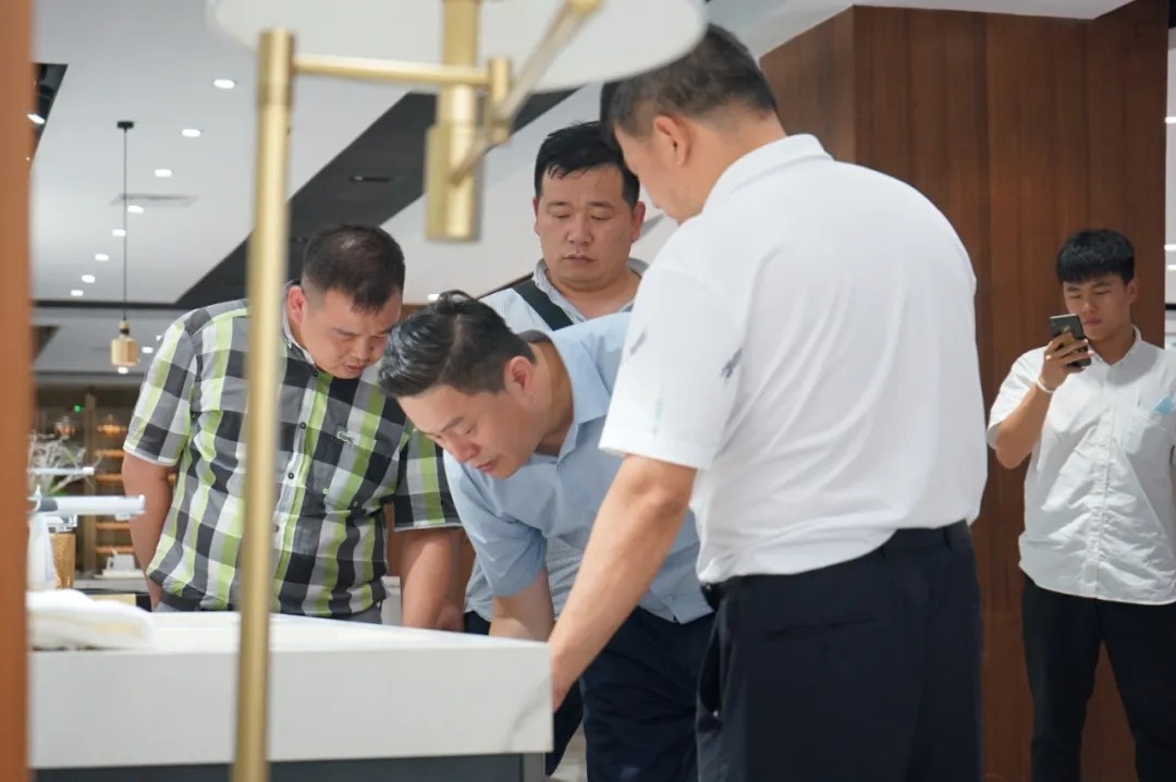譚建華董事長對依諾巖板定制產品的精美加工效果、強烈質感,留下了深刻的印象,他表示:巖板定制首先必須要解決地方上的加工痛點,才能實現全面推廣。他點贊依諾在巖板創新道路上的強勁實力和不懈投入,期望依諾繼續努力,為加快打通行業痛點帶來更多有效創新成果和貢獻。