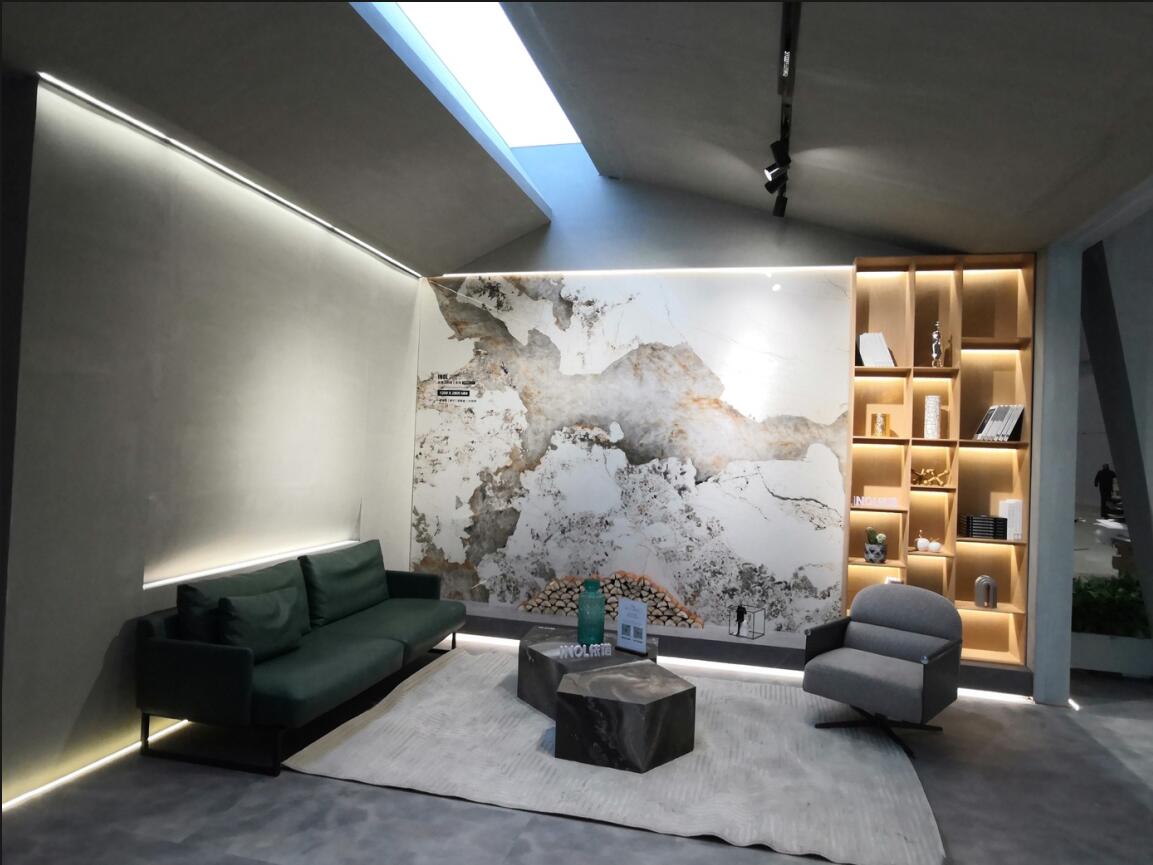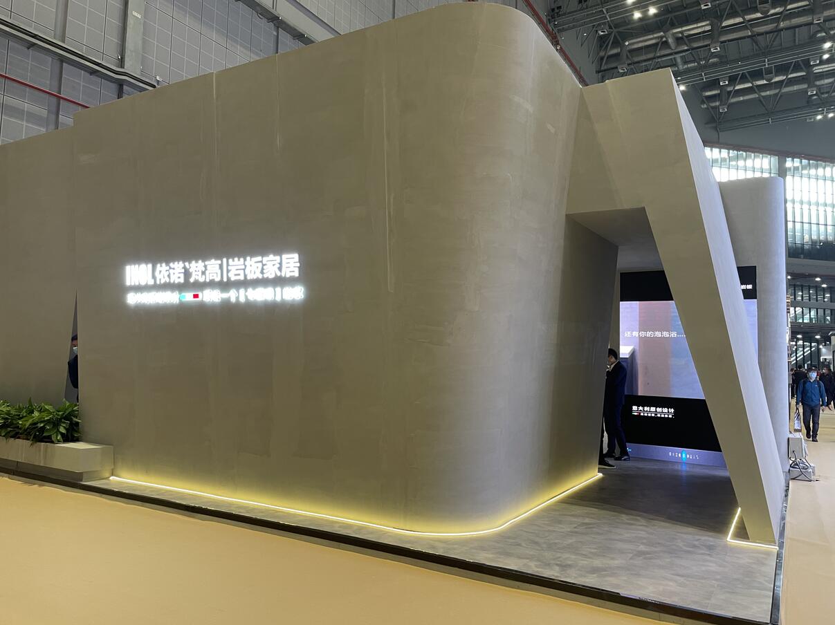 展位內部則貫徹“所見即所得”的家居空間理念,以巖板背景墻、巖板定制家具等產品綜合呈現的場景方式,體現了【依諾巖板】更全面、更豐富的產品體系。展館內依諾大巖板盛大亮相,巖板背景墻展示大氣、時尚。