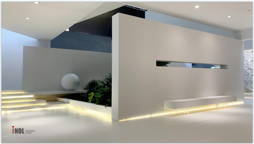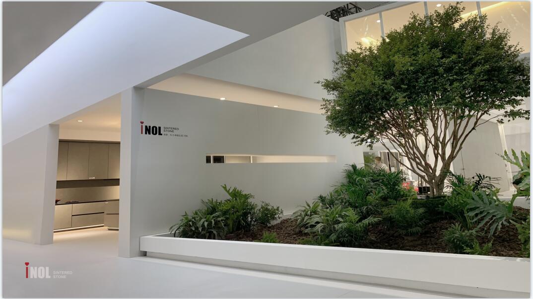 本次依諾巖板廠家的展位設(shè)計,借鑒了著名建筑大師【弗蘭克·勞埃德·賴特】及【安藤忠雄】自然人居的建筑理念,結(jié)合客廳、餐廳、廚房、臥室、浴室等【5大生活場景】,以巖板的【全方位應(yīng)用】,詮釋【幸福·家】生活。