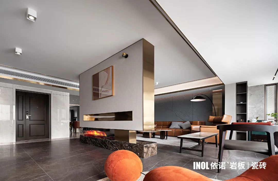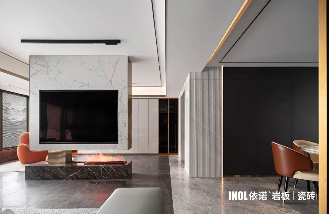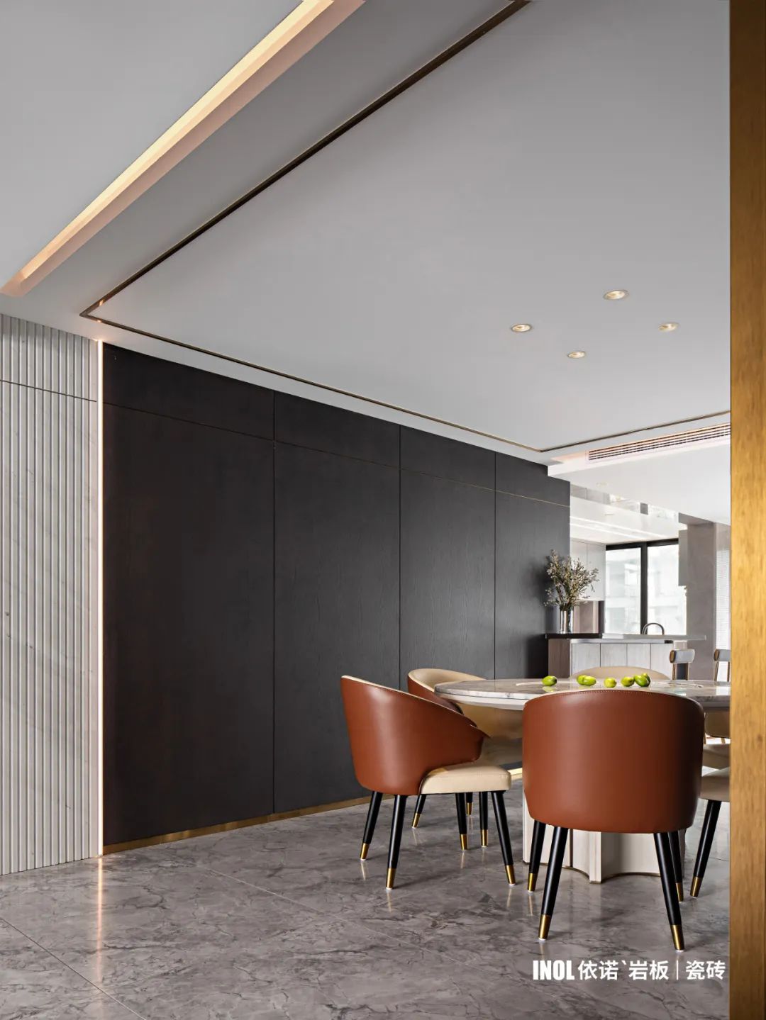 巖板/瓷磚等硬裝主材,以現代主義美學,奠定了空間高貴與個性的氣質,與其他點綴性材質相融合,制造出璀璨奢華的視覺與觸覺雙重享受,看似不經意卻又恰到好處,彰顯著設計的別出心裁。