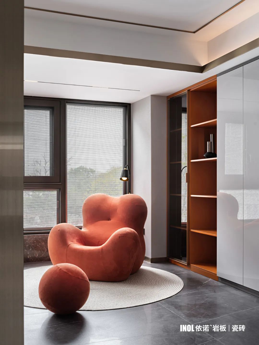 皮質元素兼具沉穩的原始感與摩登的精致感,給室內帶來了奢華又優雅的氛圍;愛馬仕橙絨面家具,時髦有活力,同時起到中和巖板、瓷磚等材質的硬朗觀感。