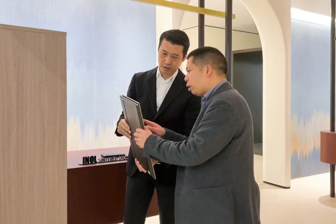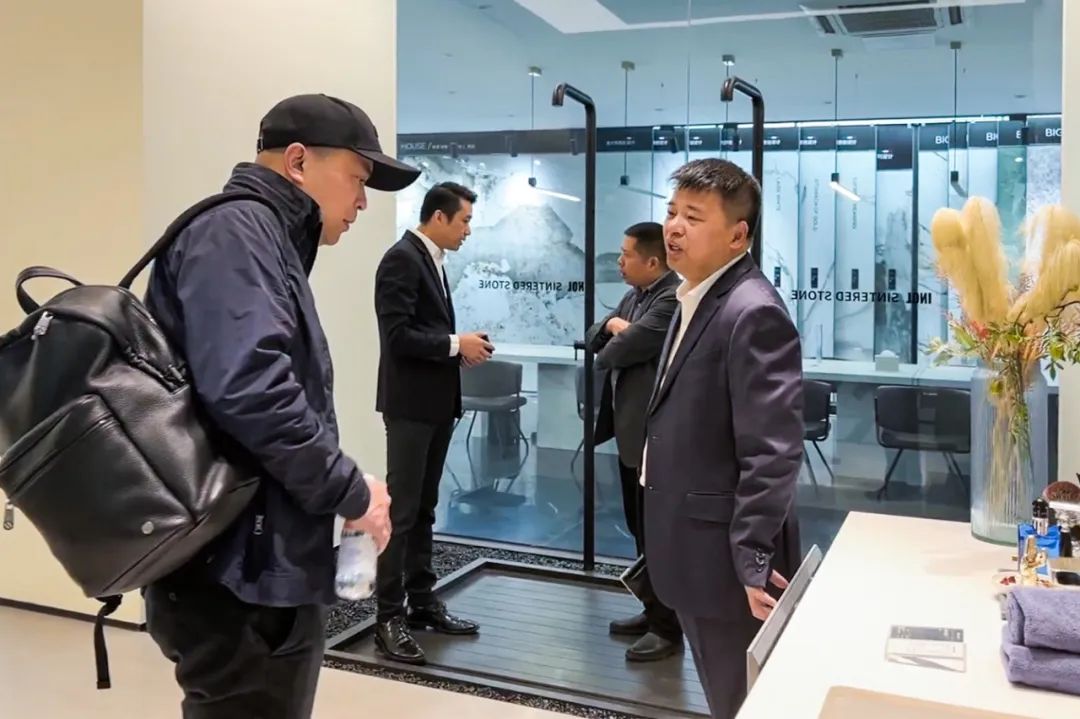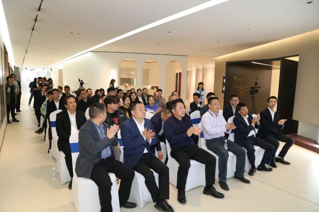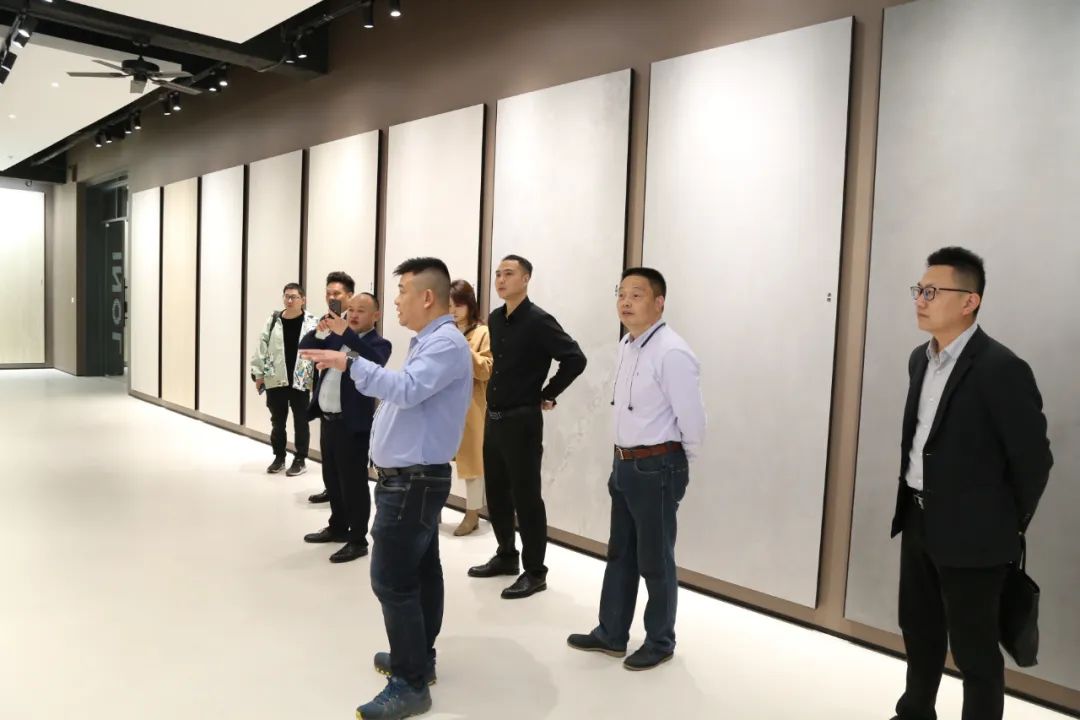 在依諾企業(yè)總裁郭萬龍,依諾企業(yè)副總裁、巖板材料中心總經(jīng)理田慶忠及依諾巖板大家居事業(yè)部總監(jiān)冼顯鑒帶領(lǐng)下,數(shù)十位衛(wèi)浴及家居定制優(yōu)秀企業(yè)代表參觀了依諾企業(yè)總部展廳,深入了解依諾巖板的最新產(chǎn)品及門、墻、地、柜一體化應(yīng)用效果。