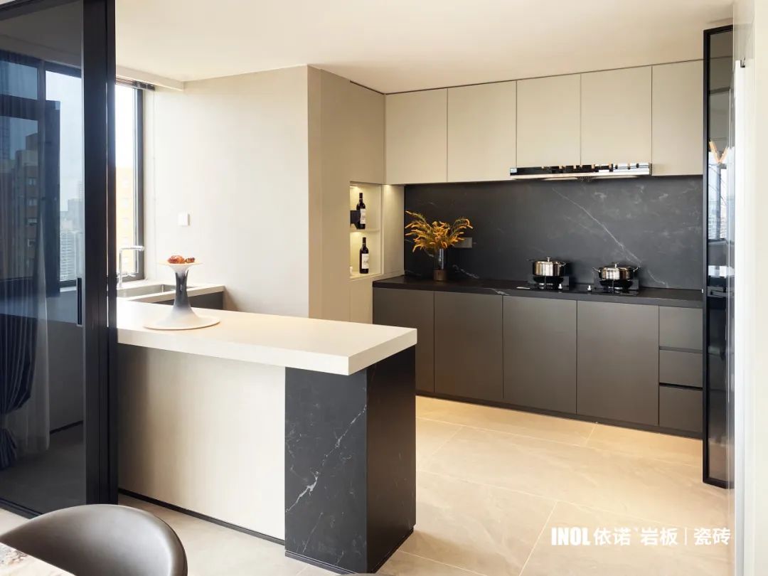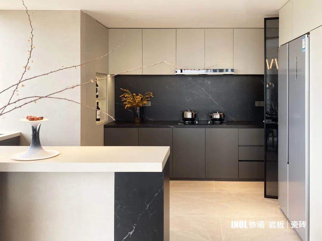 以巖板【萊姆石】及【莎士比亞黑】打造的廚房,將線條美學(xué)融入整個(gè)空間,聯(lián)通公共區(qū)域,視線一路展開,提升了整體的通透感和互動(dòng)性。