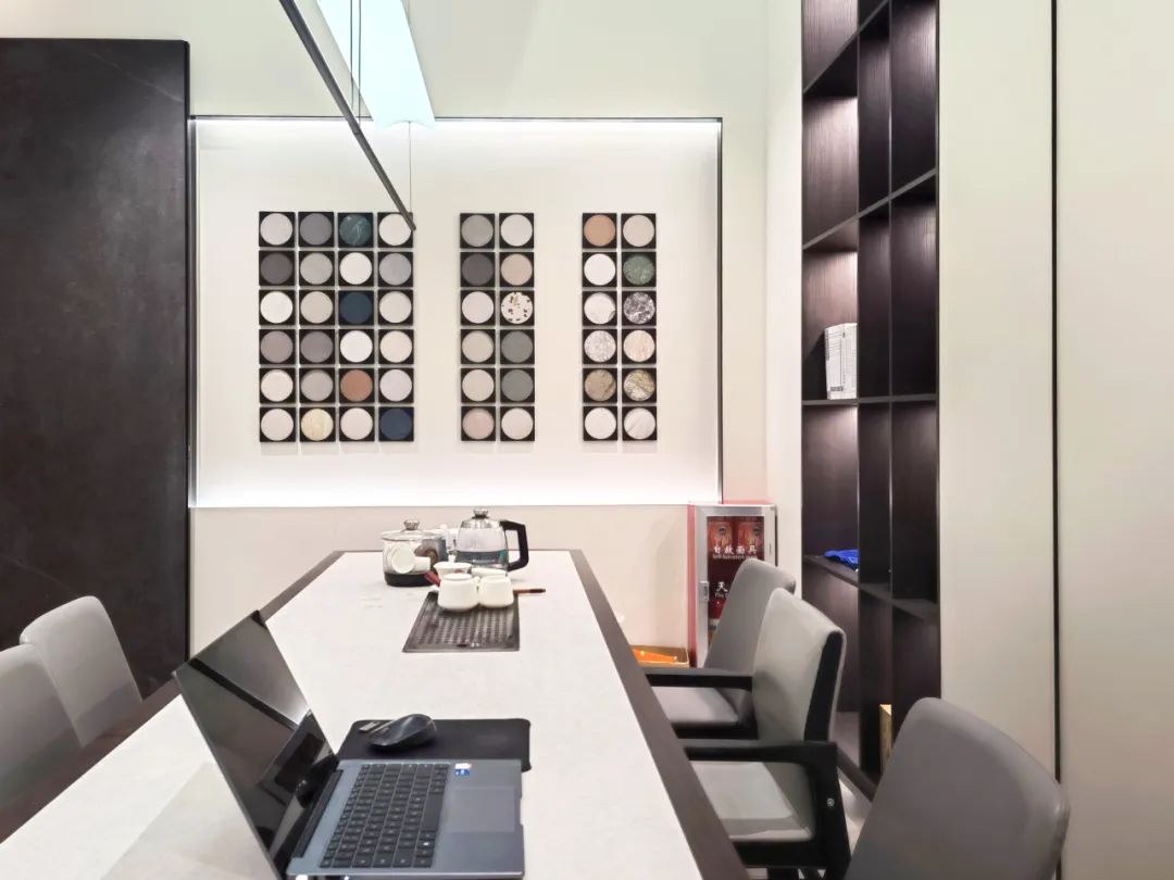 店面以“所見即所得”為設計理念,打造了囊括客廳、廚房、衛浴、茶室、會議室、步梯在內的多空間全景,綜合呈現依諾巖板、瓷磚的全方位應用,為用戶帶來更貼近生活的深度體驗。