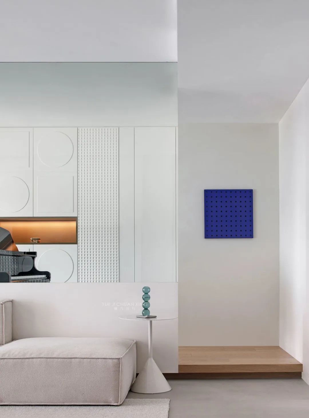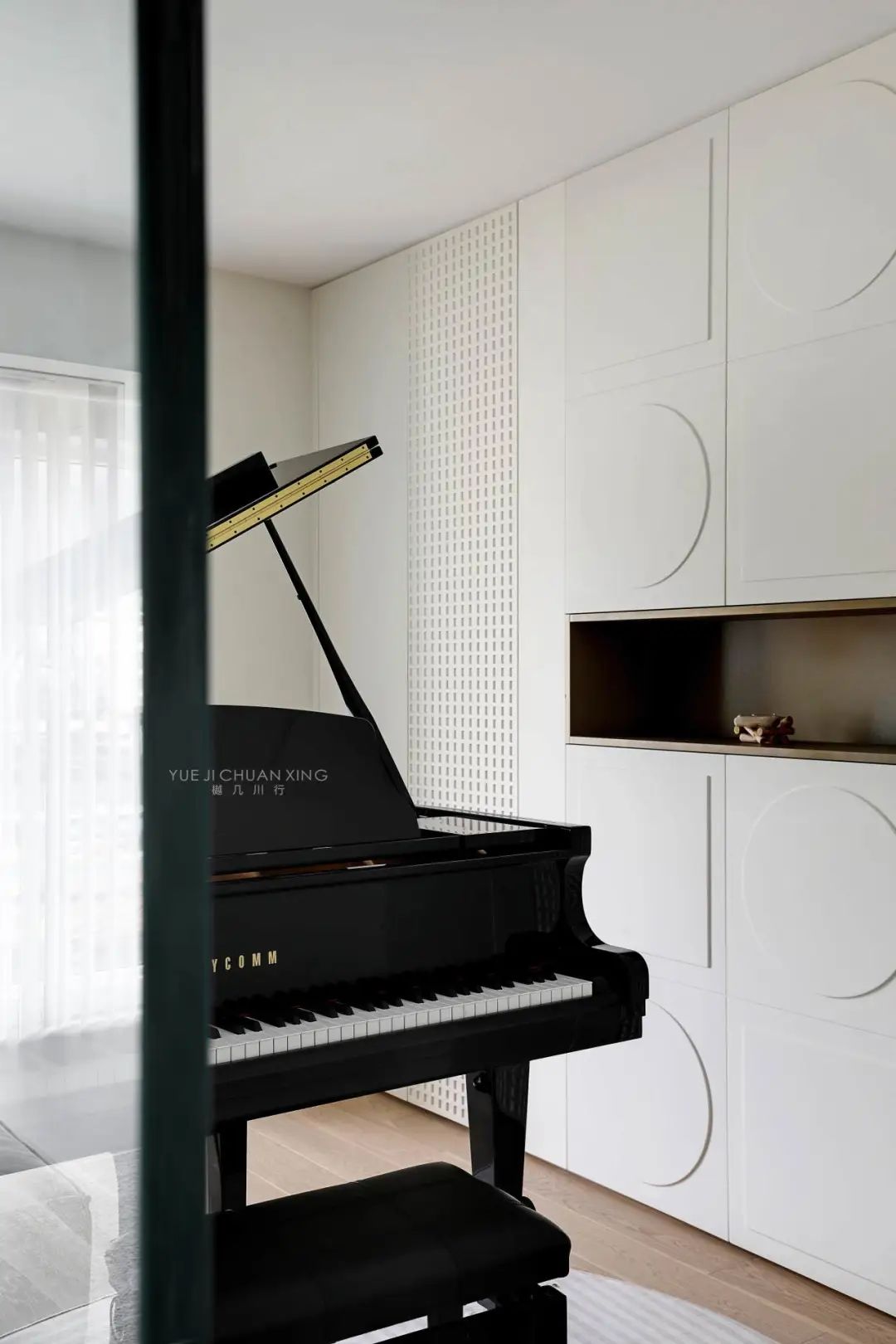 客廳與鋼琴房之間,用玻璃幕墻營造櫥窗的效果,消弭空間的邊界。添一抹「生機綠」,在光影變化中,營造豁目開襟的自然感與空間感。