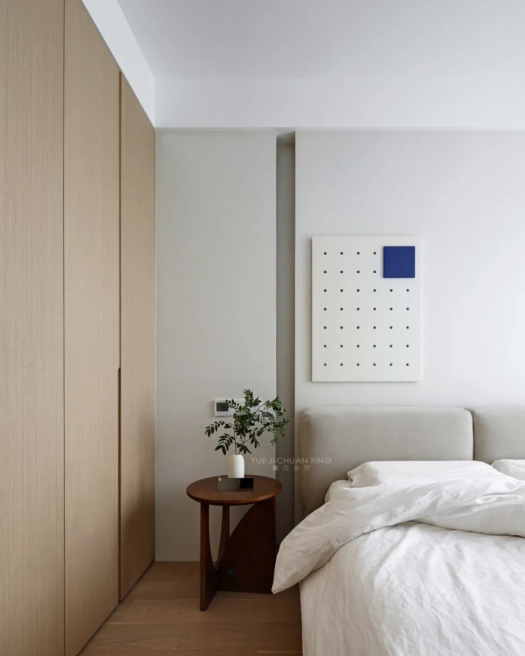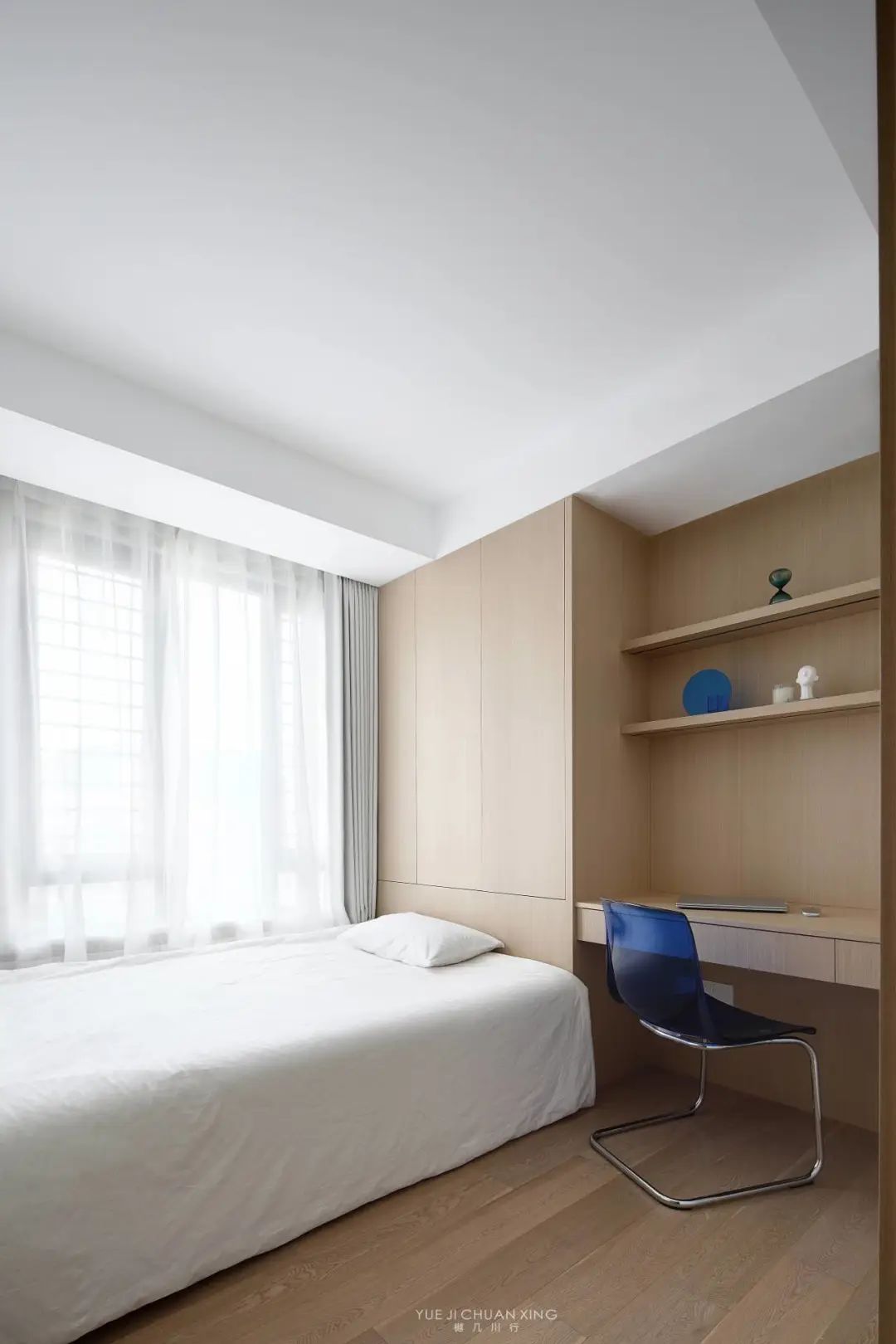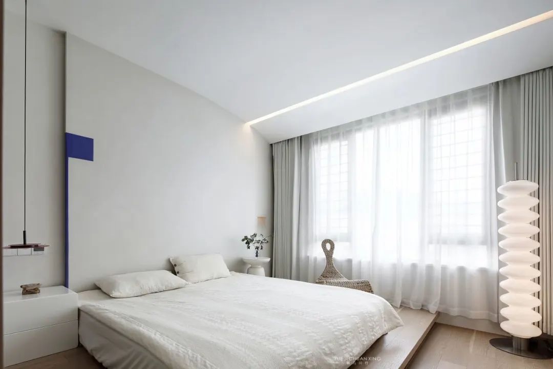 以自然之色,慢調生活。光影、白墻、原木打造的臥室空間,仿佛清風撲面,隨性而自由。藝術造型家具與藍色的幾何體塊的加入,打造一半閑適一半雅致的休憩氛圍。