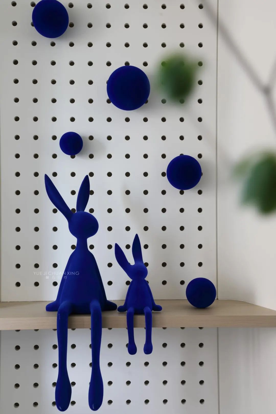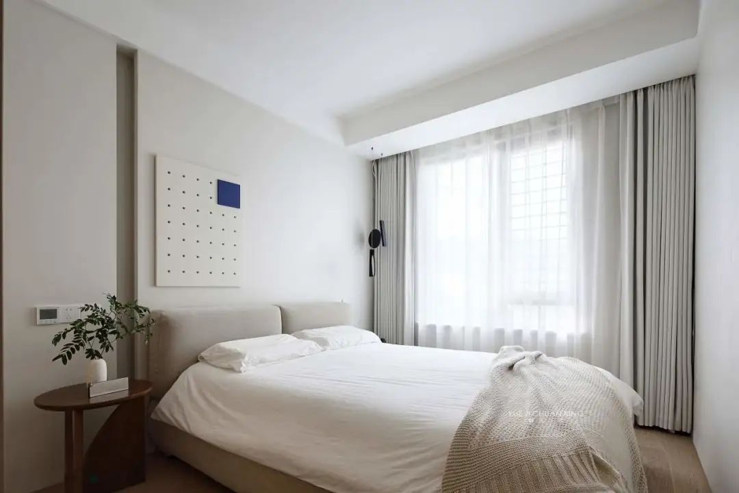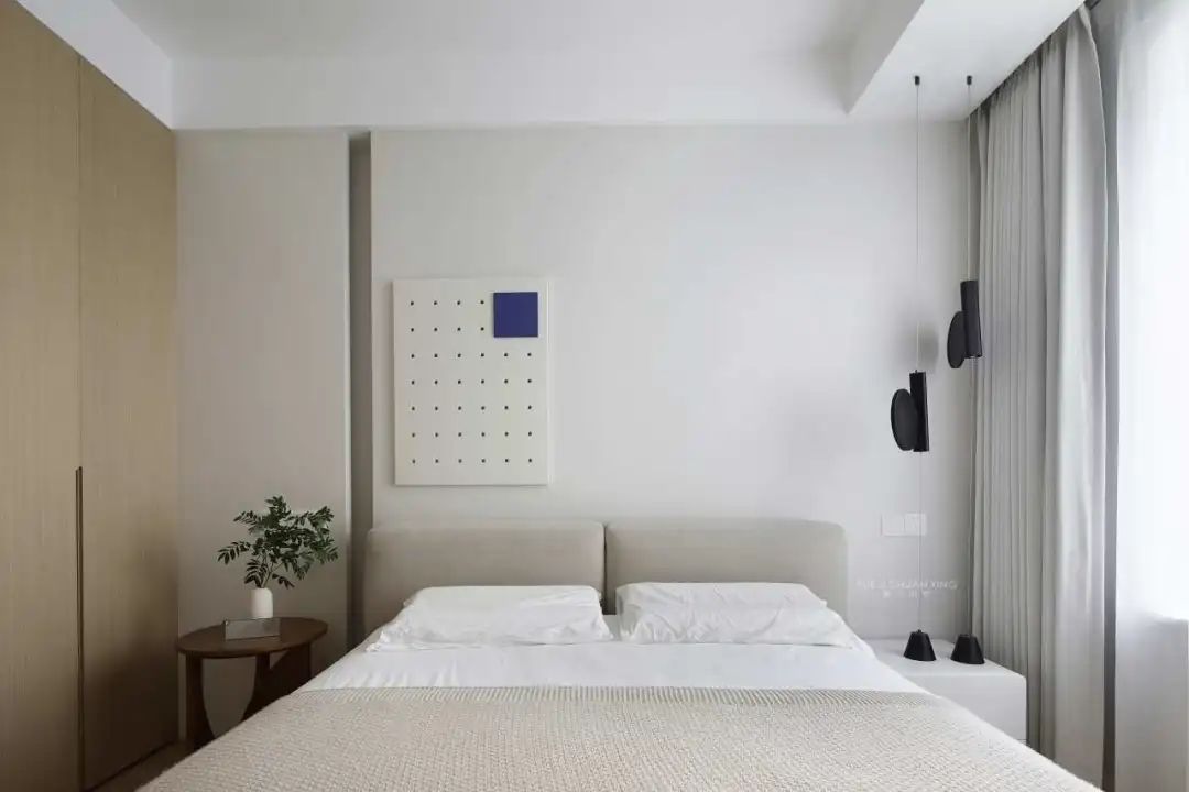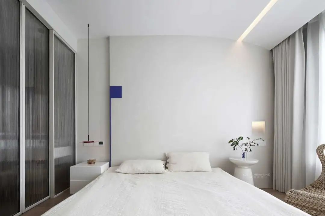 以自然之色,慢調生活。光影、白墻、原木打造的臥室空間,仿佛清風撲面,隨性而自由。藝術造型家具與藍色的幾何體塊的加入,打造一半閑適一半雅致的休憩氛圍。