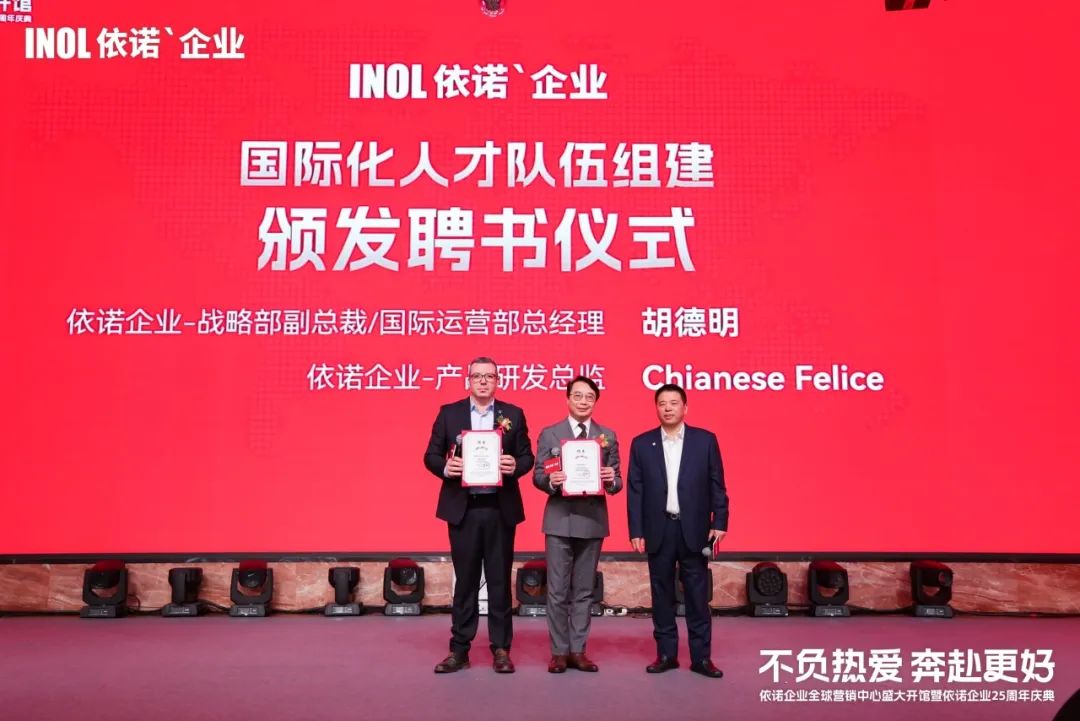 為了從頂層設計上提升產品力,通過拓展海外市場,實現更廣泛的影響力和業務延伸,依諾組建了「國際化人才隊伍」,并在年會現場舉行了聘書頒發儀式。