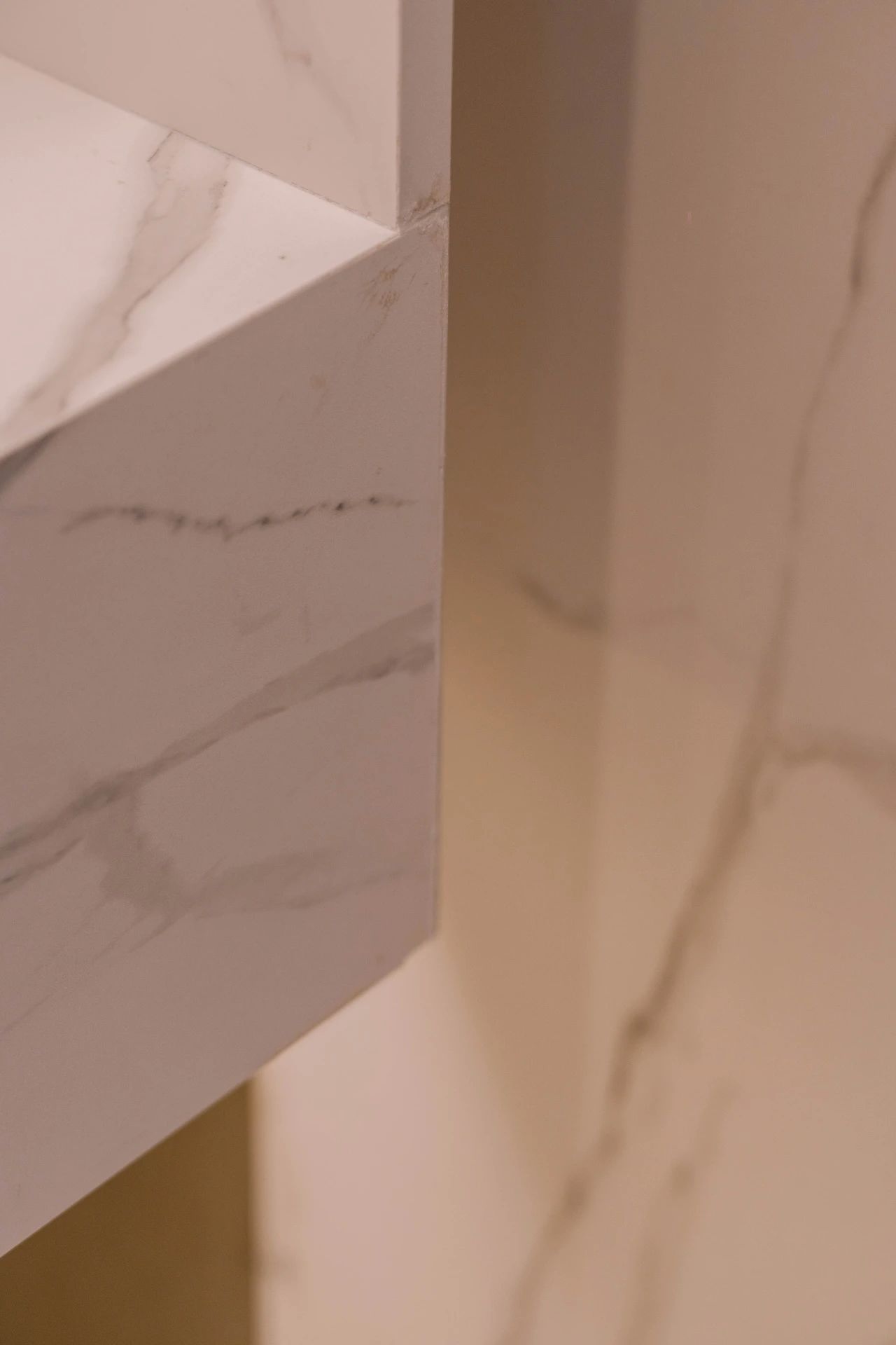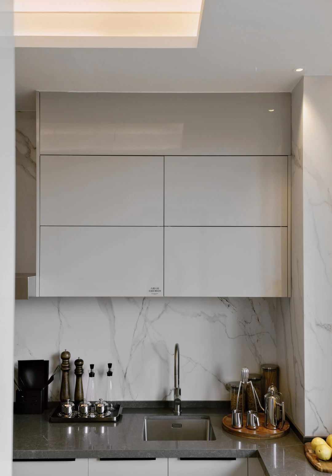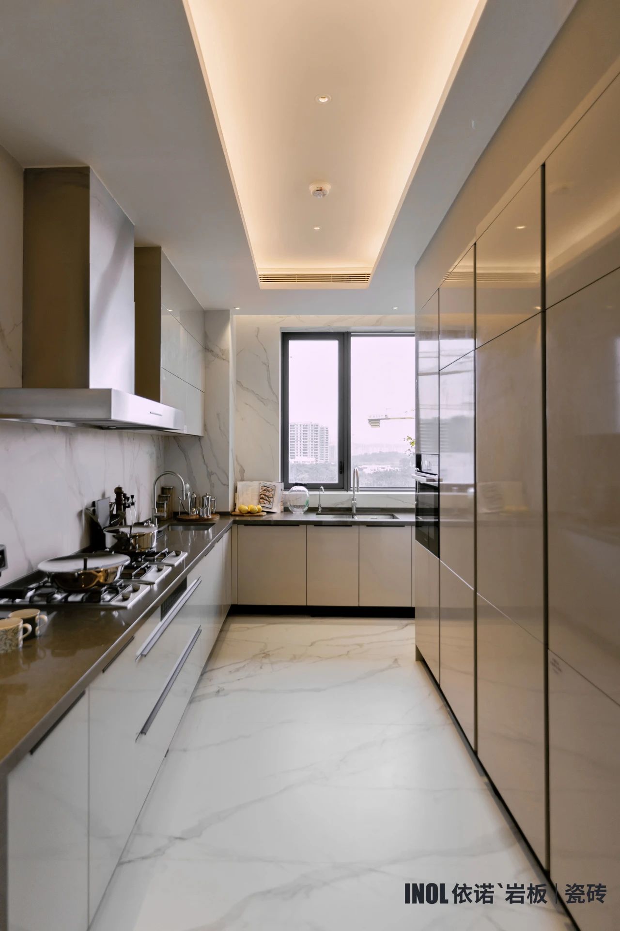 依諾巖板【紳士白】墻地搭配,呈現(xiàn)空間的溫和質(zhì)感,為餐廚空間加持靜謐之意
