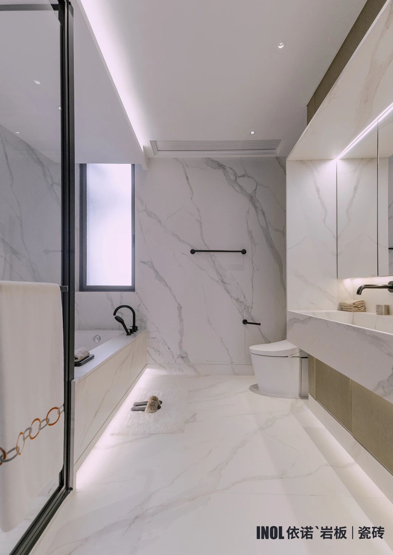 依諾巖板打造的衛(wèi)浴空間 從墻面到地面 從洗手臺(tái)到浴缸 人性化細(xì)節(jié)里 藏著生活的質(zhì)感