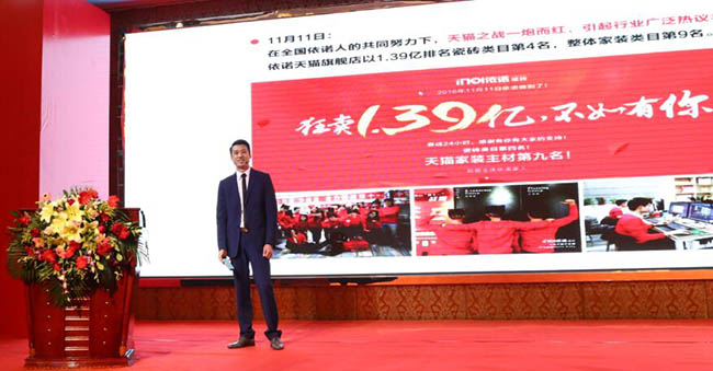 隨著依諾企業營銷中心總經理田慶忠的上臺,依諾瓷磚“成人禮· 江湖會”正式拉開帷幕。2016年,依諾瓷磚 “大”動作不斷,與意大利· 天工法拉利集團合作,引進多臺先進生產設備;通體大理石瓷磚順利量產成為業內最早生產通體大理石瓷磚的企業之一,率先推出大規格的通體大理石和仿古磚;11月的天貓之戰,依諾更是一炮而紅,以1.39億的成交量位列瓷磚類排名第四,一夜間,無人不識依諾;這一年,依諾從默默無聞的旁觀者,到漸入佳境的行業新貴,成為行業熱議與關注的焦點,依諾贏得了大家的尊重和喝彩,但田總表示,這僅僅只是依諾的一個起點。