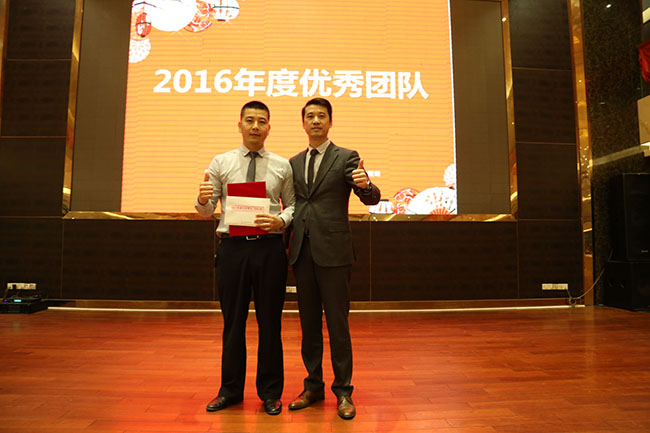 ▲依諾企業(yè)營銷中心總經理田慶忠為優(yōu)秀團隊(研發(fā)部)頒獎