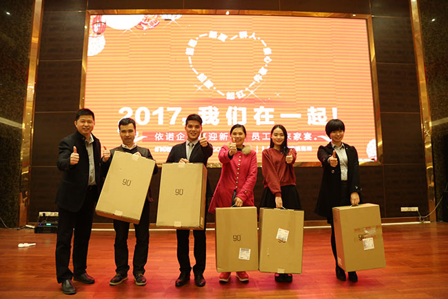 依諾企業(yè)的領導們出手如此大方,與依諾企業(yè)2016年的耀眼成績不無關系。2016年對于依諾企業(yè)來說可謂風生水起的一年,不僅新產品、新展廳、新工廠、新渠道,新的營銷模式都贏得了業(yè)內的廣泛贊譽,還獲得了包括中國陶瓷行業(yè)年度創(chuàng)新品牌,中國陶瓷行業(yè)互聯(lián)網+全渠道創(chuàng)新品牌,金磚獎年度最佳展廳金獎等10項大獎。依諾企業(yè)感謝全體”依諾家人“的付出,2017年,我們在一起,再億起!