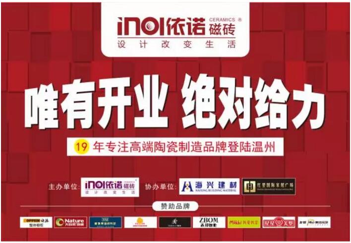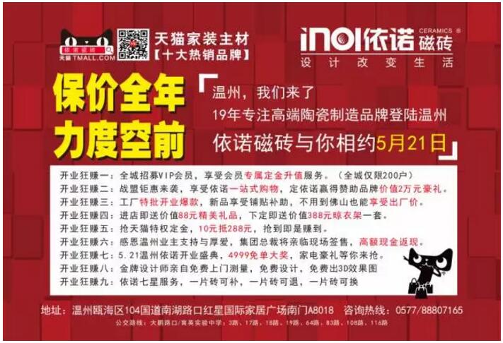 為慶祝依諾瓷磚品牌登陸溫州,現正推出開業九大福利,各種福利強勢來襲,搶到就是賺到!機不可失!時不再來!